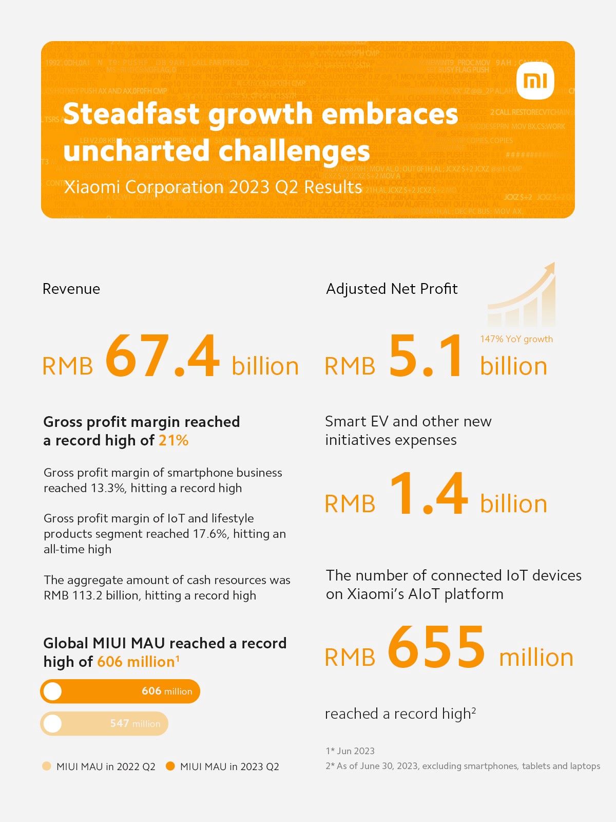 Xiaomi Corporation („Xiaomi“ или „Групата“; борсов код: 1810), компания за потребителска електроника и интелигентно производство със смартфони и интелигентен хардуер, свързани с платформата интернет на нещата („IoT“ ), обяви своите неодитирани консолидирани резултати за трите месеца, приключили на 30 юни 2023 г. („2023 Q2“ или „Периодът“). След изпълнението на ключовата корпоративна стратегия за „двоен акцент върху мащаба и рентабилността“ преди две тримесечия, Xiaomi постигна стабилна печалба и растеж на бизнеса с множество оперативни показатели, достигнали исторически връх. През второто тримесечие на 2023 г. общите приходи на Xiaomi достигнаха 67,4 милиарда RMB, което представлява ръст на тримесечие („QoQ“) от 13,2%. Коригираната нетна печалба достигна 5,1 милиарда RMB, ръст на годишна база (“YoY”) от 147,0%. Това бележи най-високата тримесечна печалба от четвъртото тримесечие на 2021 г., далеч надхвърляйки консенсуса на пазара. През първата половина на 2023 г. коригираната нетна печалба на Xiaomi достигна 8,4 милиарда RMB, доближавайки нивото на коригираната нетна печалба от миналата година.