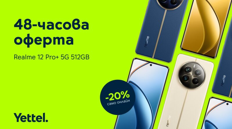 Новото ексклузивно онлайн предложение от Yettel е за смартфона Realme 12 Pro+ 5G. Той се предлага с 20% намаление, ако бъде закупен в комбинация с мобилен план от оператора и платен в брой, до 12:00 часа на 12 юни.