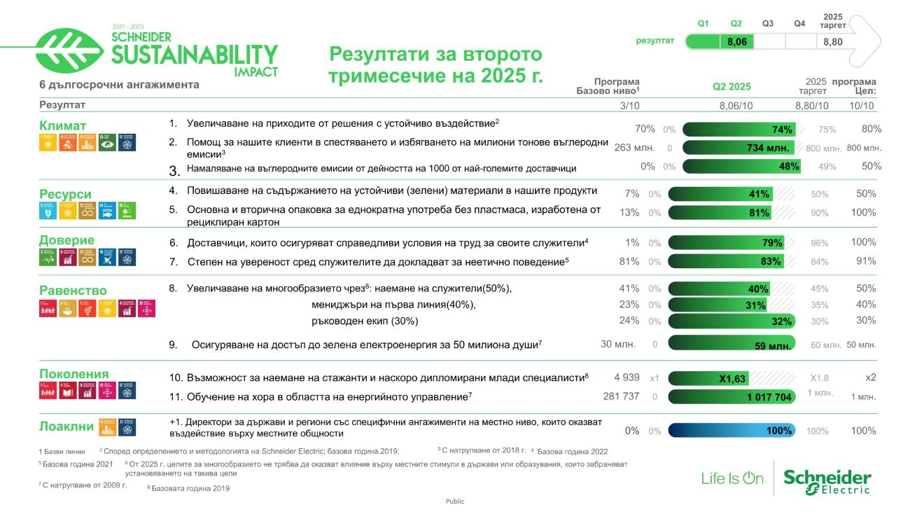 Schneider Electric, обяви нефинансовите си резултати за второто тримесечие на 2025 г. (Q2 2025), с което отбеляза ключов етап в навечерието на последната фаза от изпълнението на програмата Schneider Sustainability Impact (SSI) 2021 – 2025. Шест месеца преди приключването ѝ компанията продължава да демонстрира своя ангажимент към измерими резултати, приобщаващ подход и трансформативни действия в сферата на екологичните, социални и управленски цели (ESG). За тримесечието SSI индексът на Schneider Electric достигна 8,06 от 10, което потвърждава постоянния напредък по ключовите стълбове на устойчивото развитие.