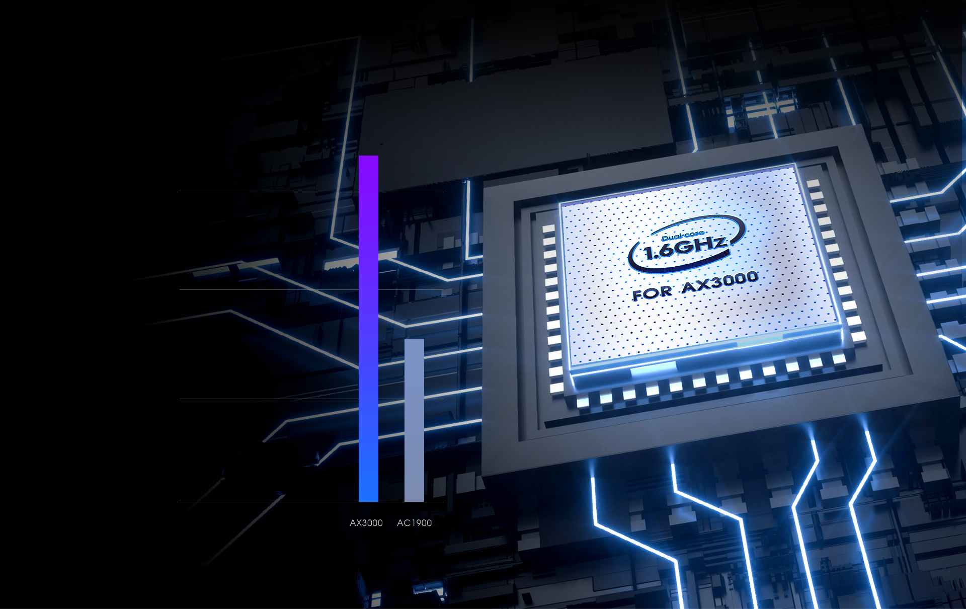 Надеждната и бърза wi-fi връзка със скорости до 3000 Mbps е подсигурена от двете честотни ленти: 574 Mbps на 2,4GHz и 2402 Mbps на 5GHz. Моделът предлага обща мрежова скорост от 2976 Mbps – 574Mbps при 2.4GHz и 2402Mbps при работа на 5GHz.
