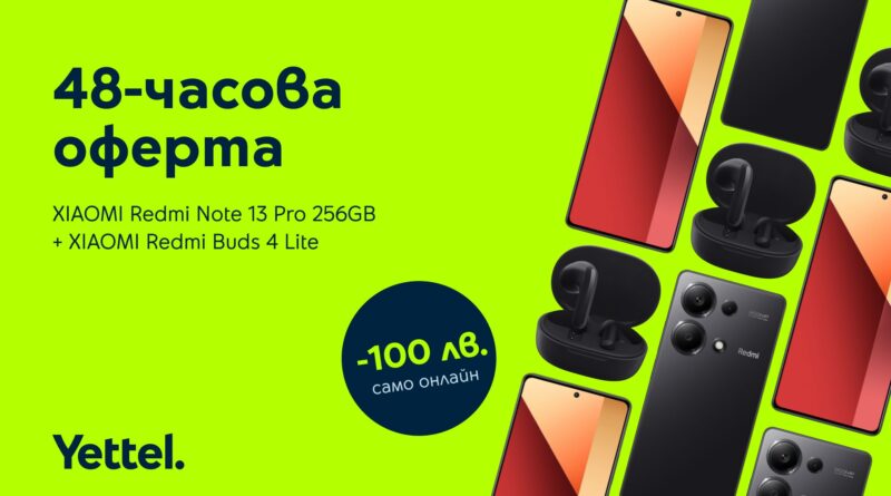 От днес до 12:00 часа на 7 август всички настоящи и бъдещи клиенти на Yettel могат да се възползват от специално пакетно предложение за смартфон и слушалки на XIAOMI. Redmi Note 13 Pro и Redmi Buds 4 Lite могат да бъдат закупени със 100 лева отстъпка при покупка в брой и подписване на двугодишен договор за абонаментен план. Промоционалната им цена в комбинация с Total Unlimited 64.99 след отстъпката е 199.99 лева.